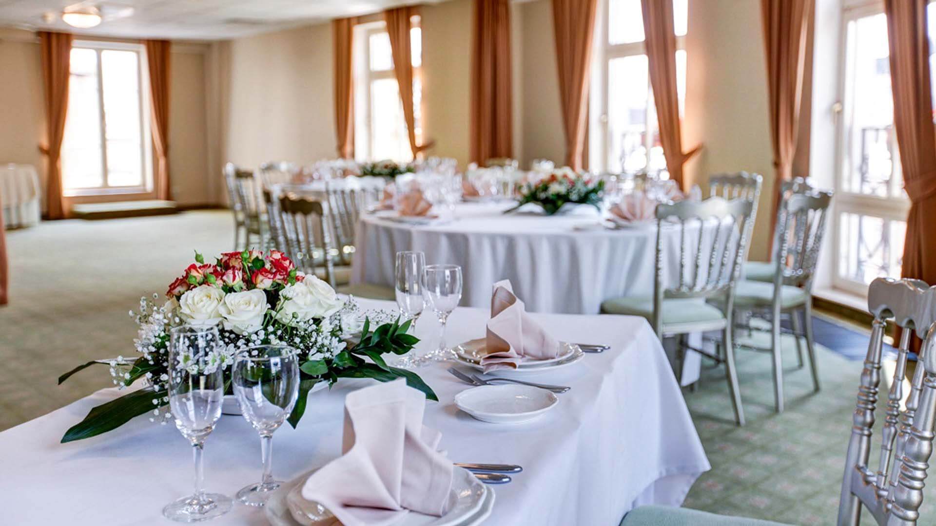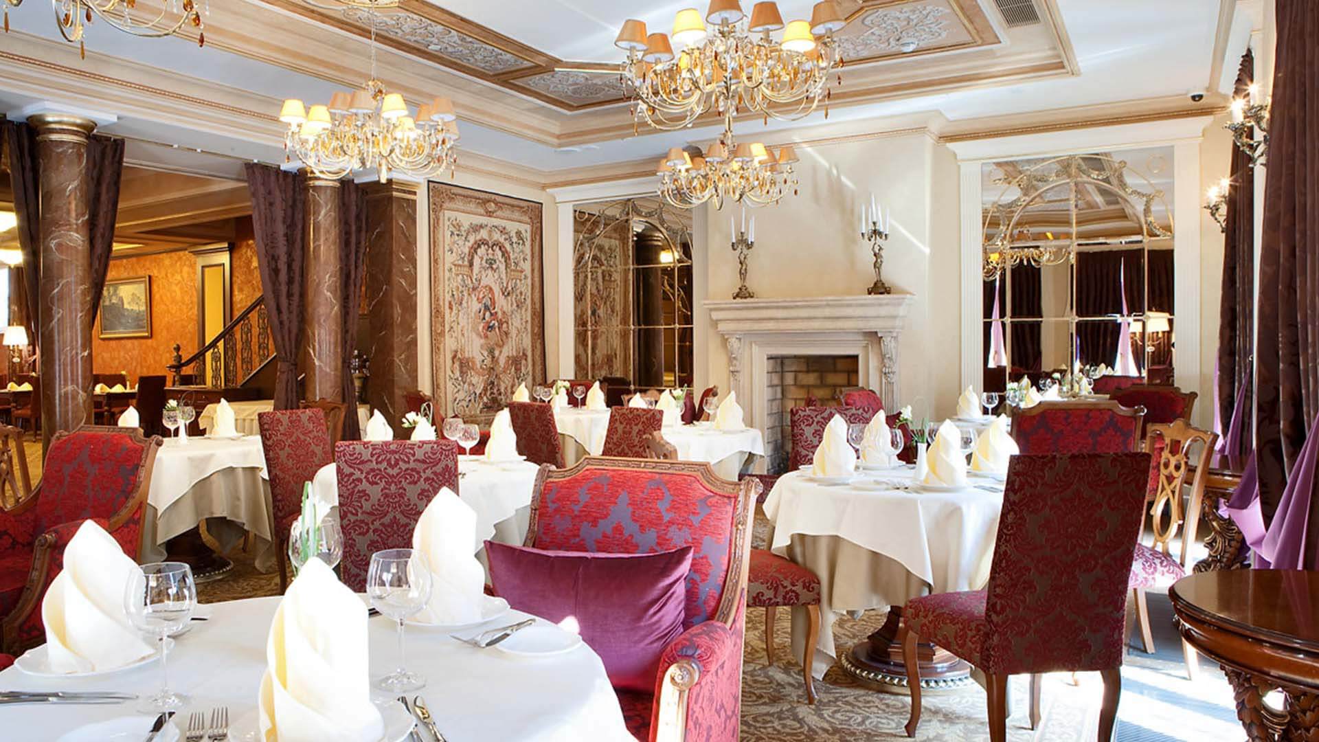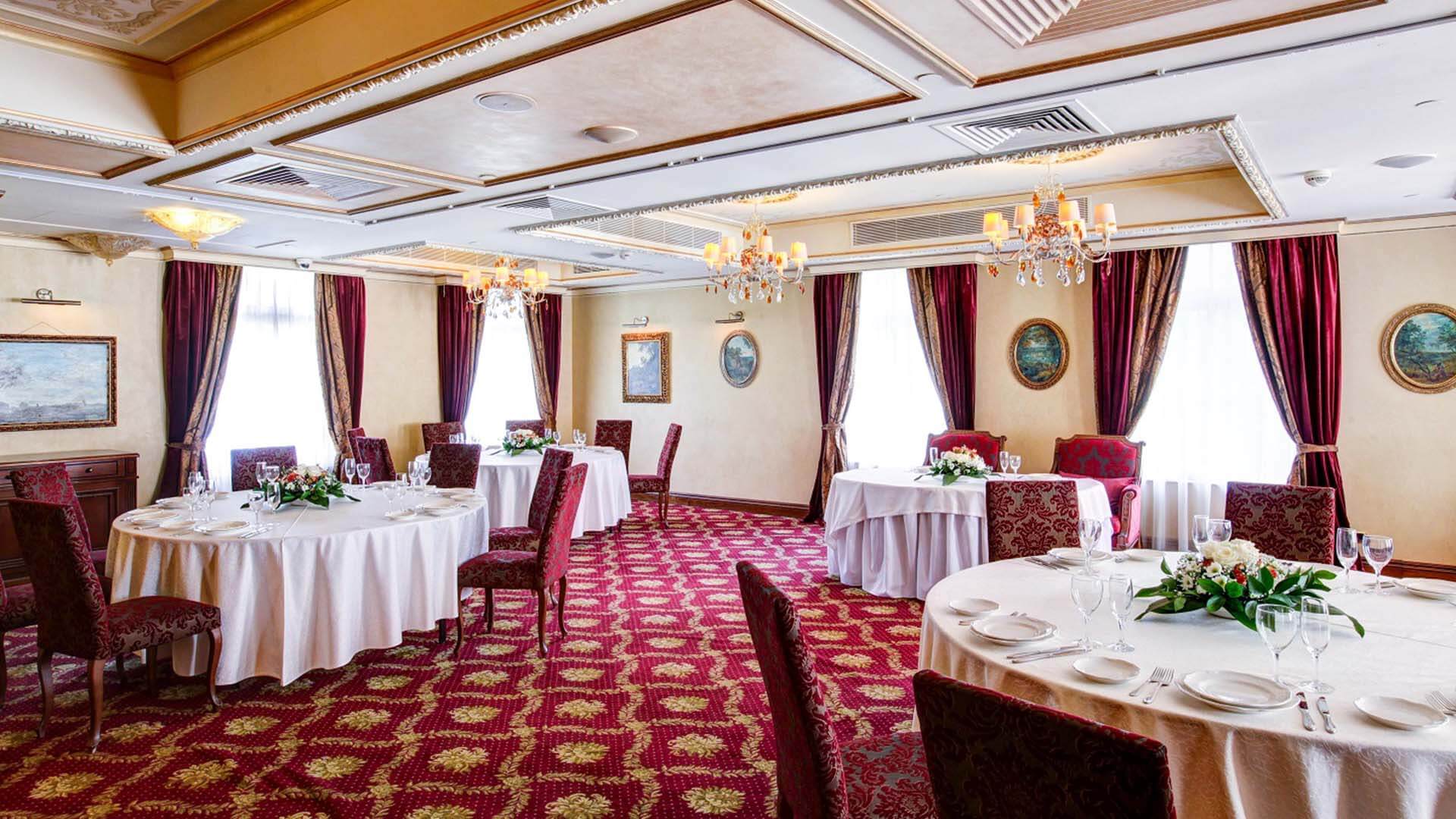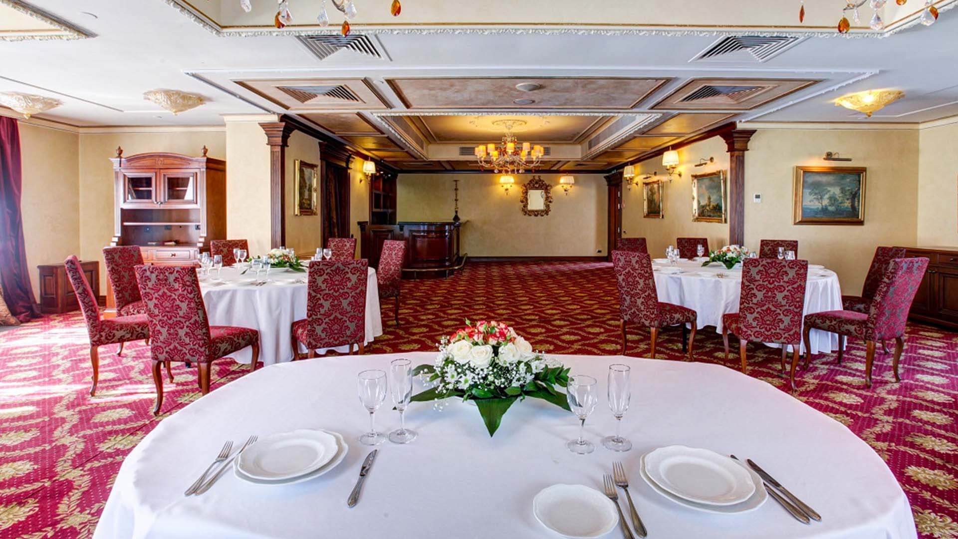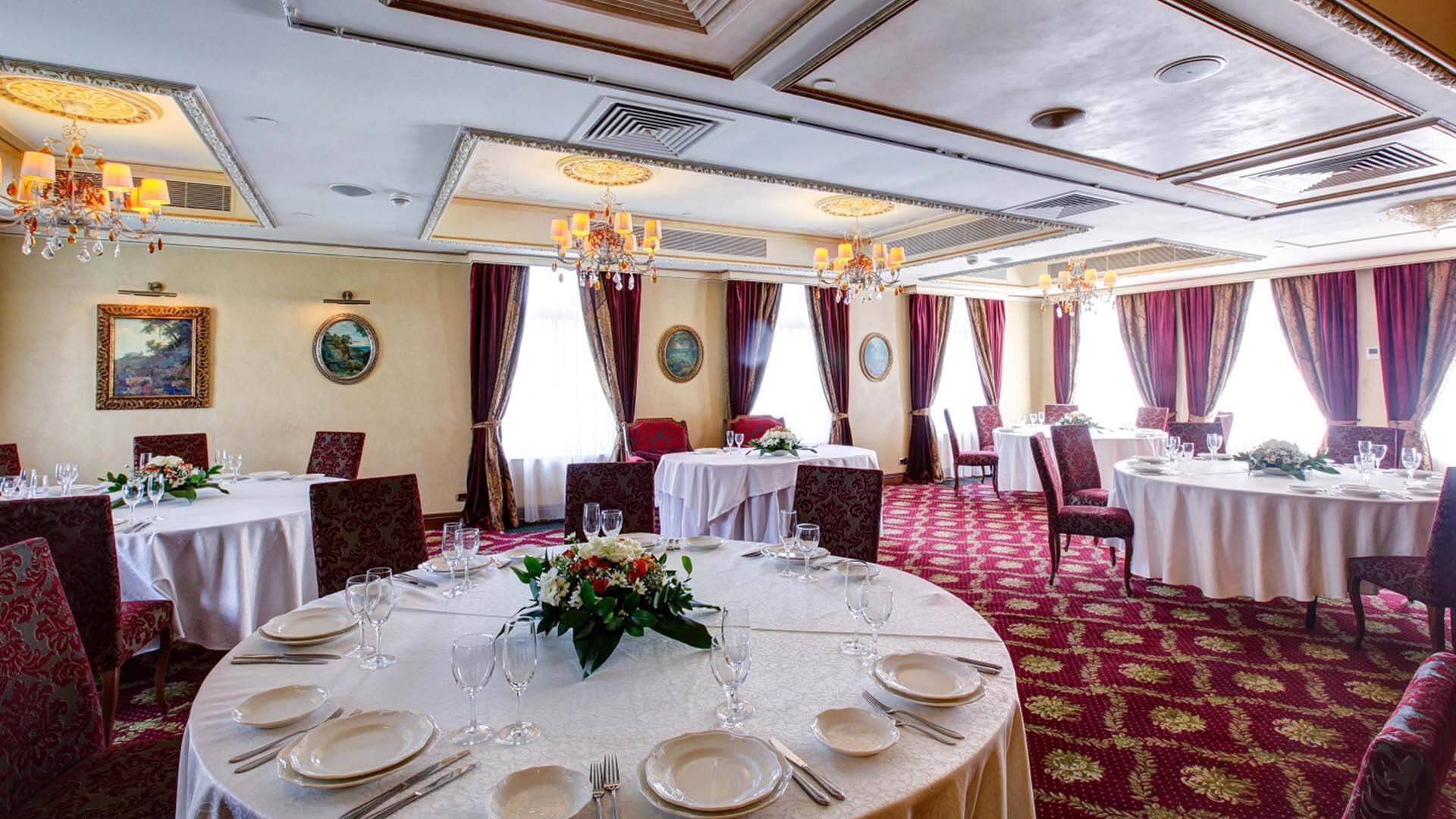 Интерьер зала выполнен в благородных бордово-золотых тонах, дополнен изящными картинами, люстрами и роскошным текстилем. Эти детали создают ощущение роскоши и комфорта.
